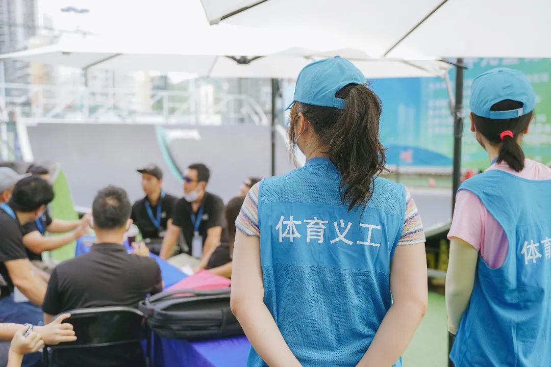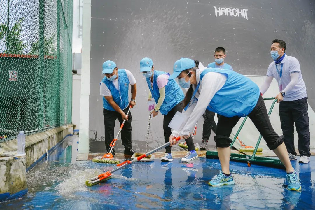 比赛次日为室外场地,体育义工奋力清理因暴雨留下的积水