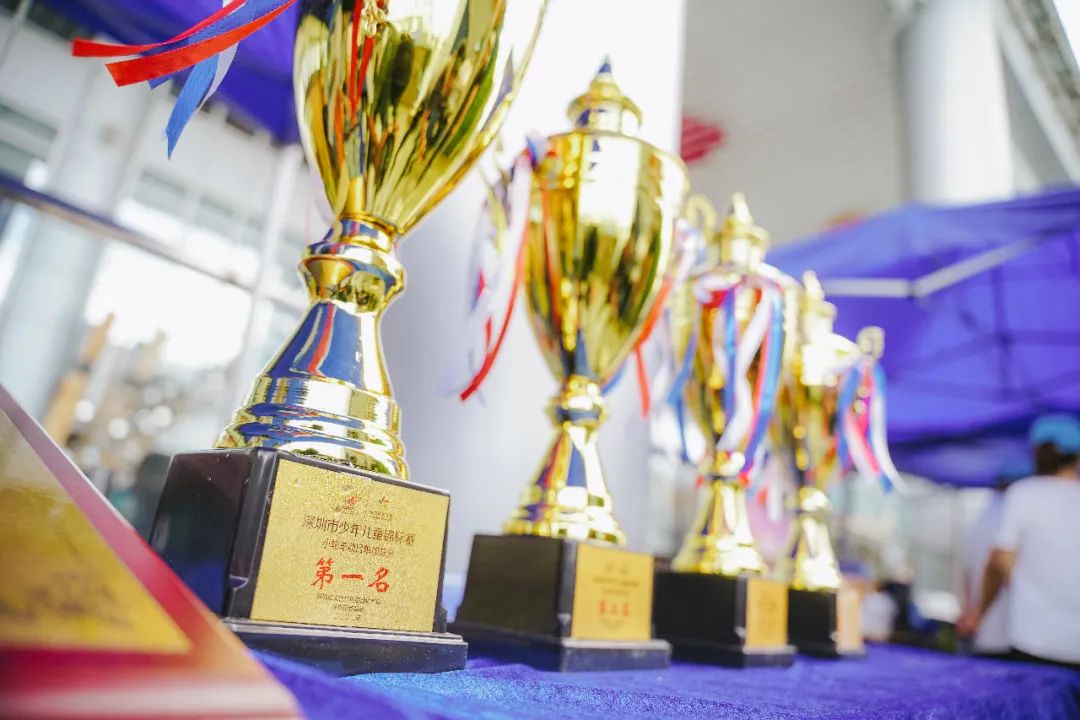 锦标赛裁判长芮戈冽(右一)与各区获奖区队合影,第一名南山区教练刘弋韬(左三)、第二名罗湖区教练梁乐民(左二)、第三名福田区教练林鑫(左四)、第四名宝安区教练黄苇(左一)