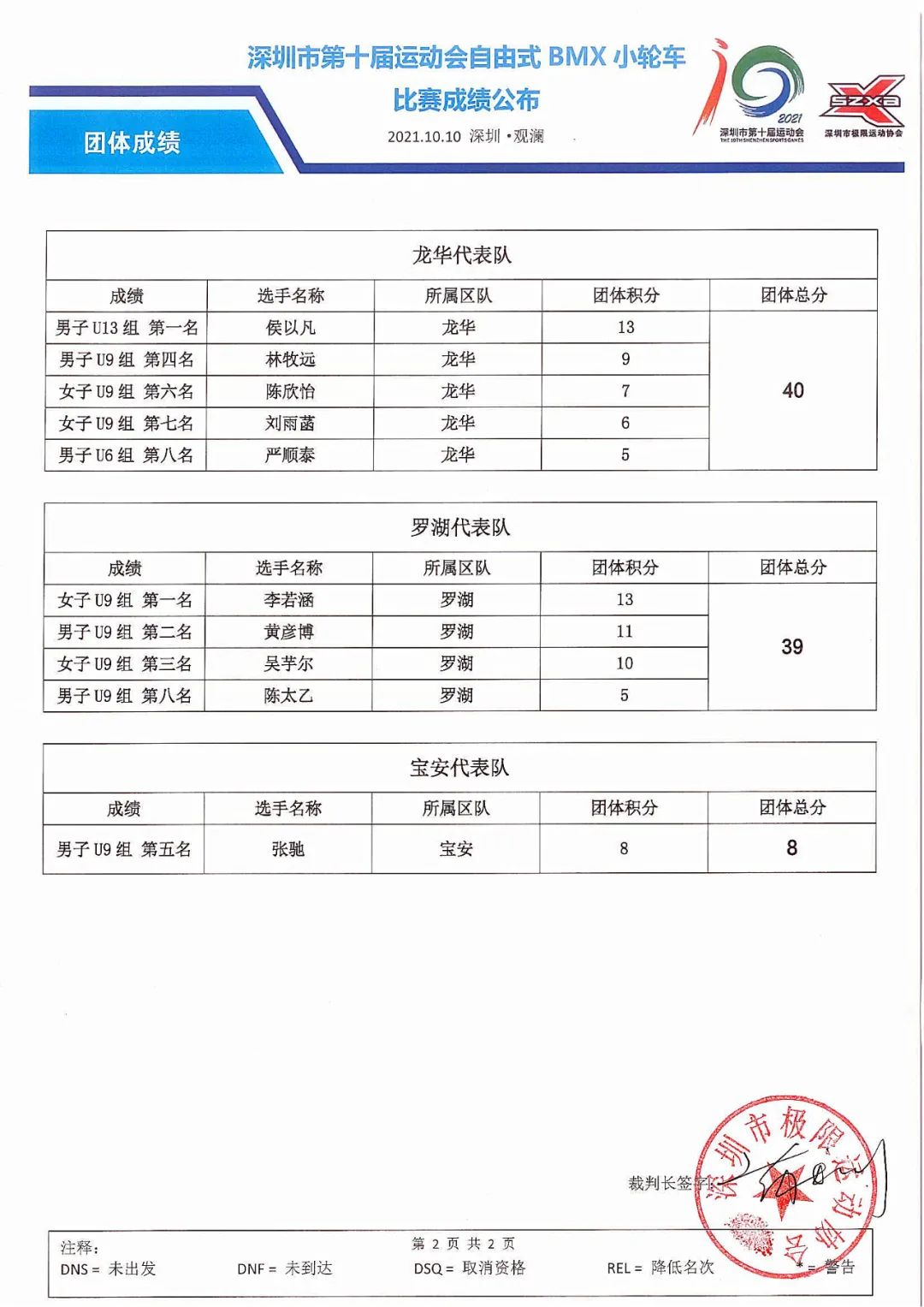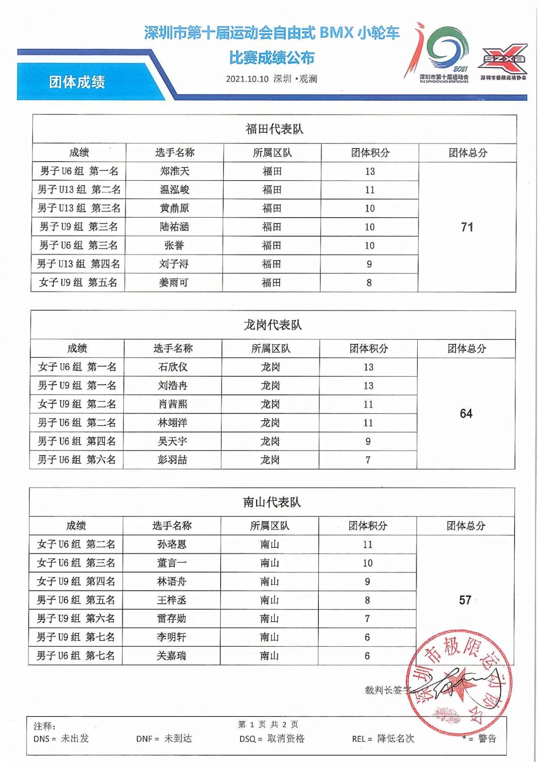 团体积分方面,福田区代表队以团体积分71分获得第一名,龙岗区积64分位居第二,南山区积57分获得第三,四五六名分别为龙华、罗湖及宝安区代表队。